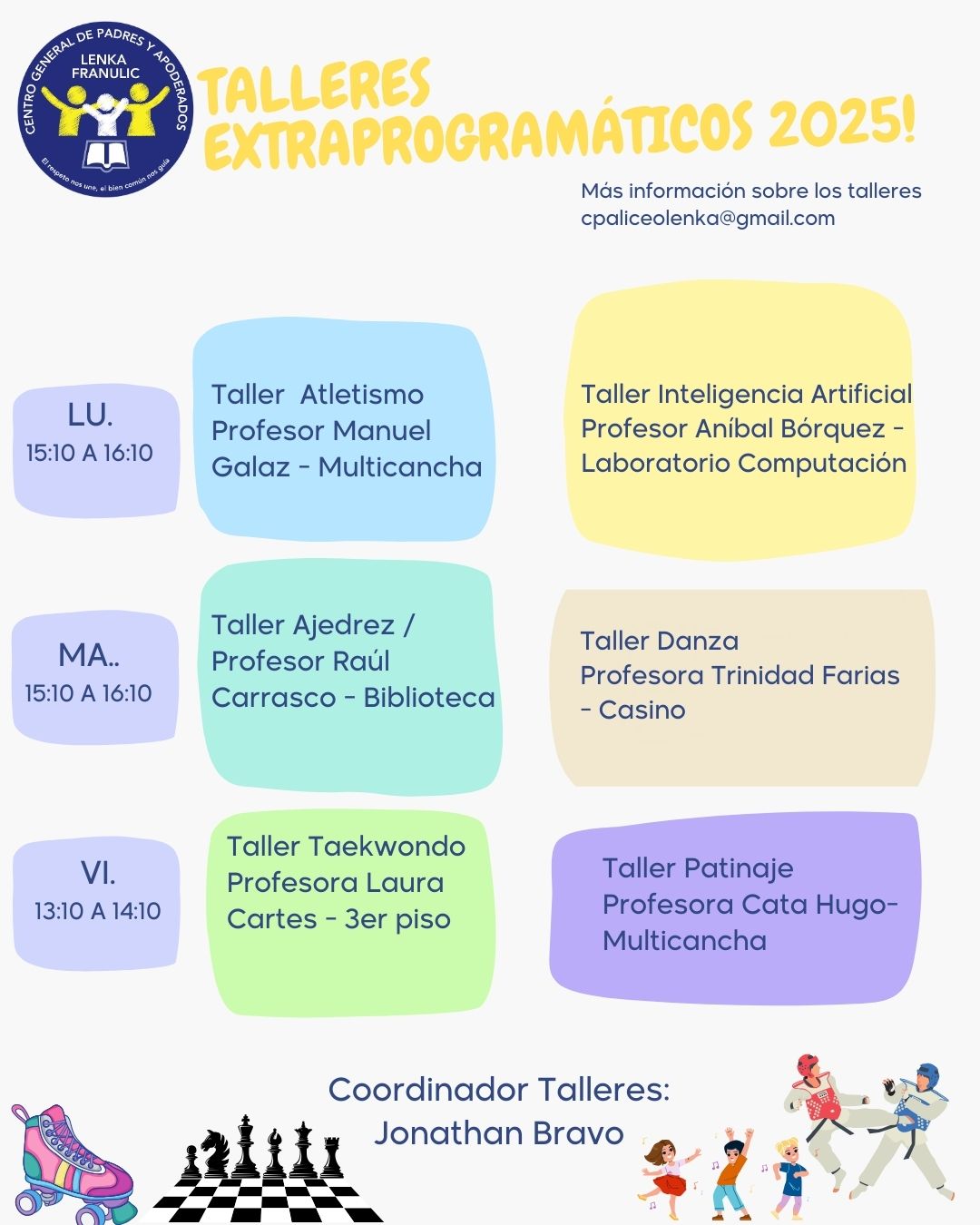 Les compartimos la oferta de talleres extraprogramáticos, coordinados por el Centro General de Apoderados, a quienes agradecemos su gestión y constante apoyo.