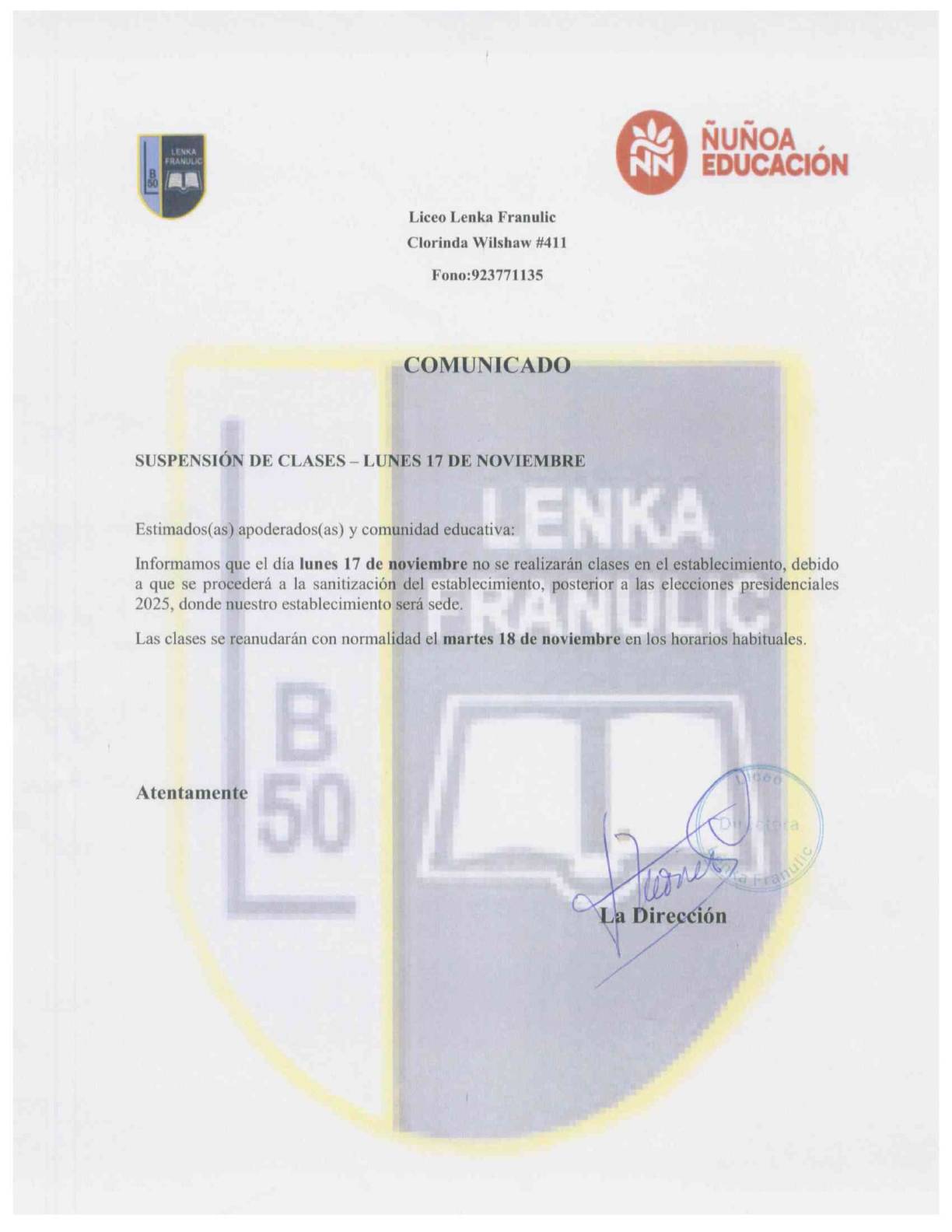 Suspensión de clases Lunes 17 de Noviembre