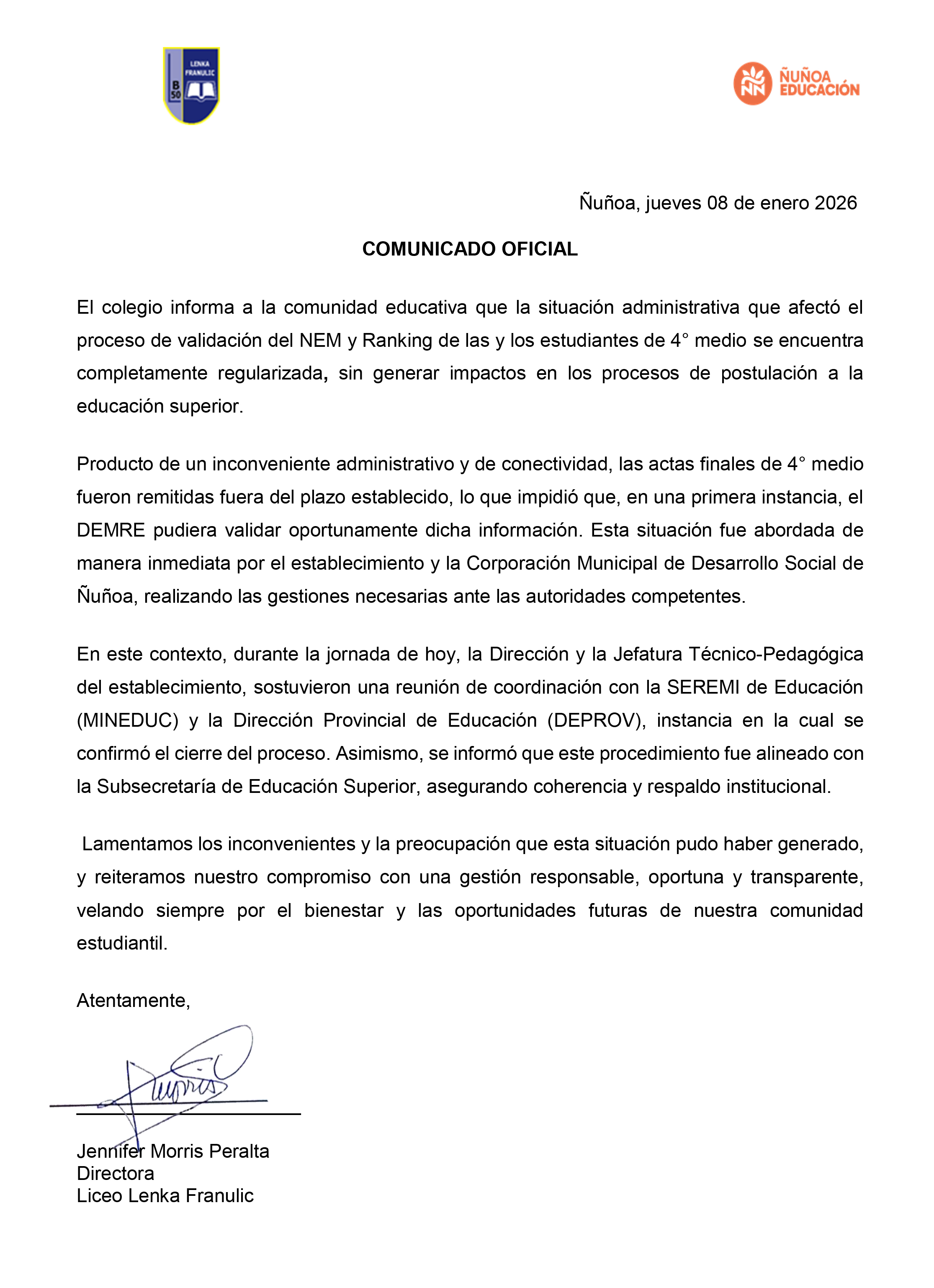 Comunicado oficial 8 de Enero