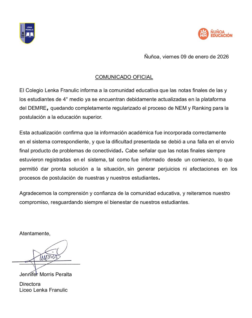 Comunicado oficial 9 de Enero